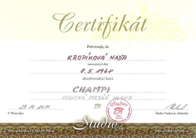 V roce 2010 jsme získali certifikát k provádění indické masáže hlavy.